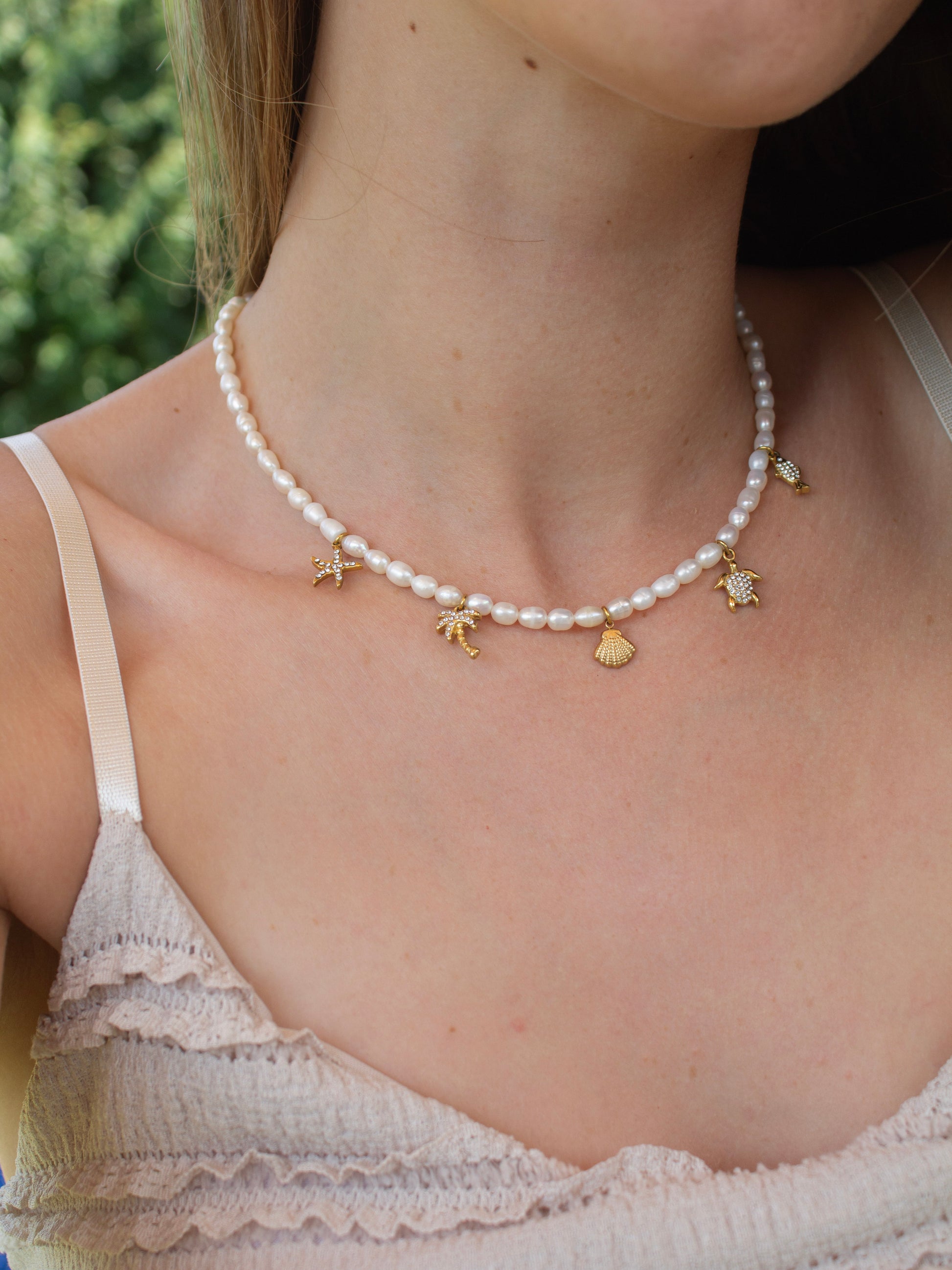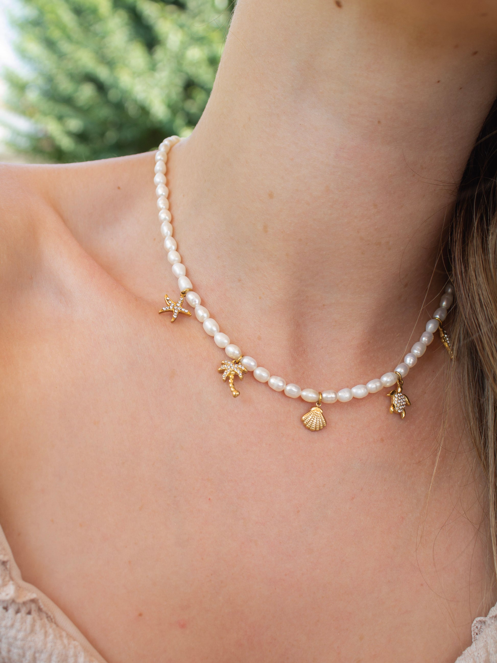 O colar Treasures of the Sea é feito com pérolas naturais de água doce e pendentes inspirados no oceano - cada detalhe foi escolhido para representar a beleza, a fluidez, a riqueza da vida e a força do mar.
